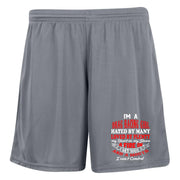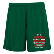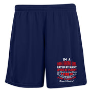 For the fearless and self-assured ladies who are ready to take on the track in style and comfort, we present our "I'm A Drag Racing Girl Hated By Many Loved By Plenty" Ladies' Moisture-Wicking 7 inch Inseam Training Shorts.