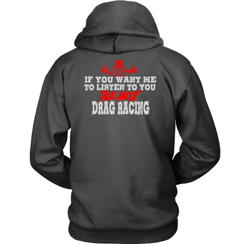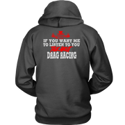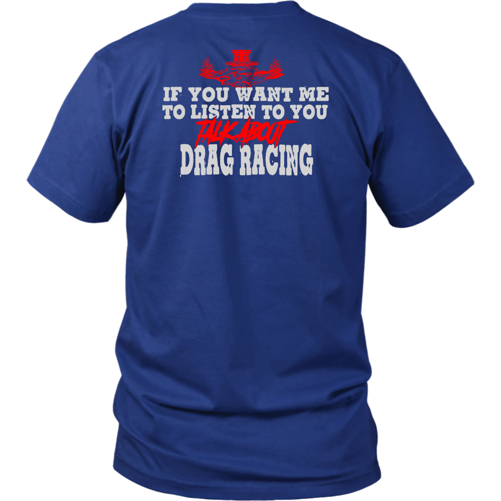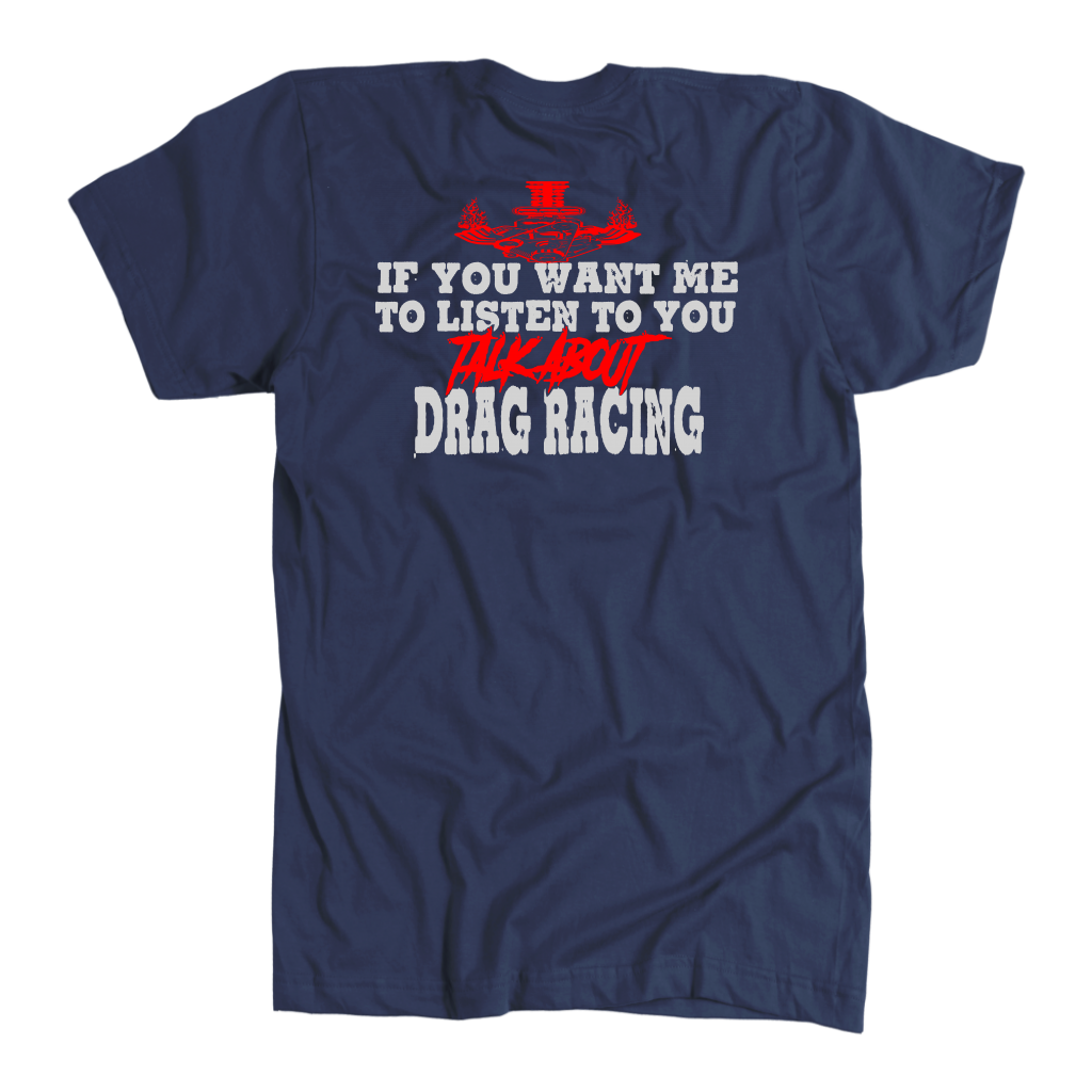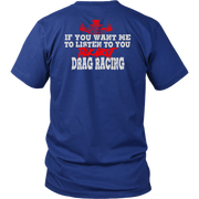 Wearing one of these "If You Want Me to Listen to You Talk about Drag Racing T-Shirts" is more than just a fashion statement; it's a statement of commitment to the lifestyle of a drag racer. Put them on with confidence to demonstrate that you're always up for a chat about acceleration, speed, and the thrill of the race. These shirts are certain conversation starters whenever you find yourself in the company of other motorsports fans, whether at the track, a car meet, or just hanging out. Get suited up, and let everyone see how much you love drag racing.