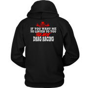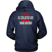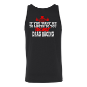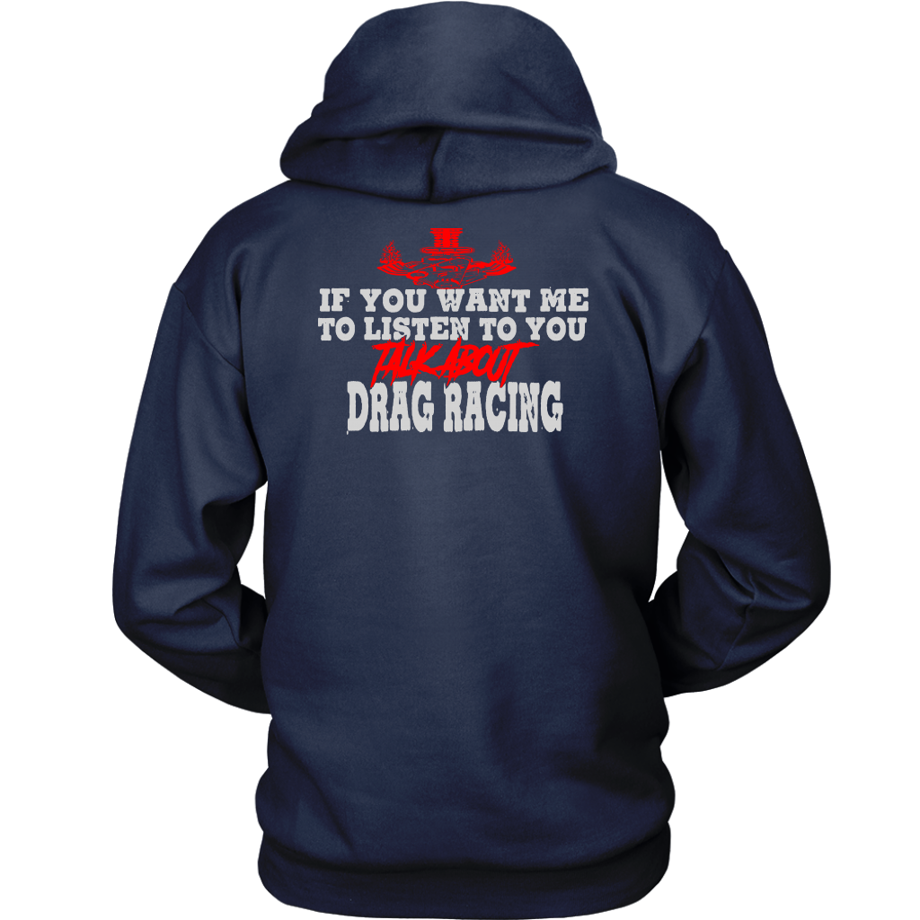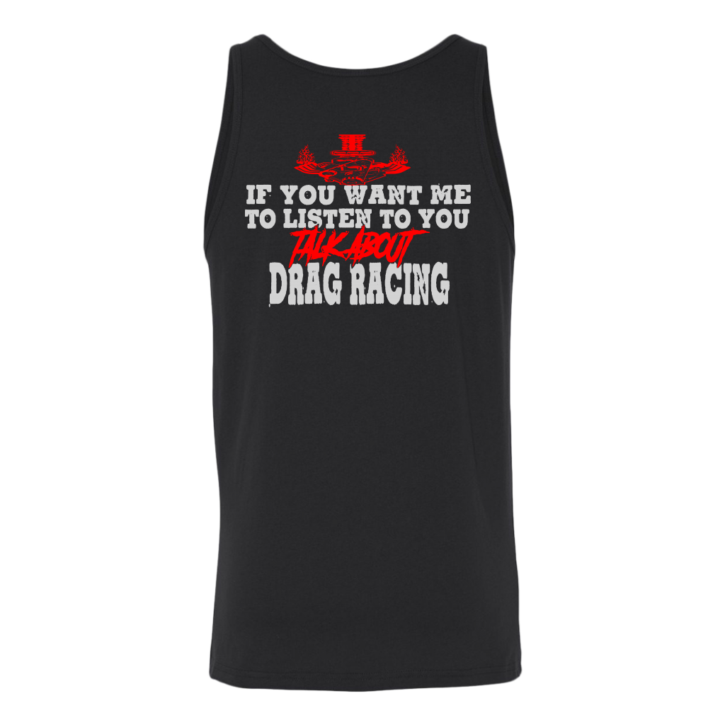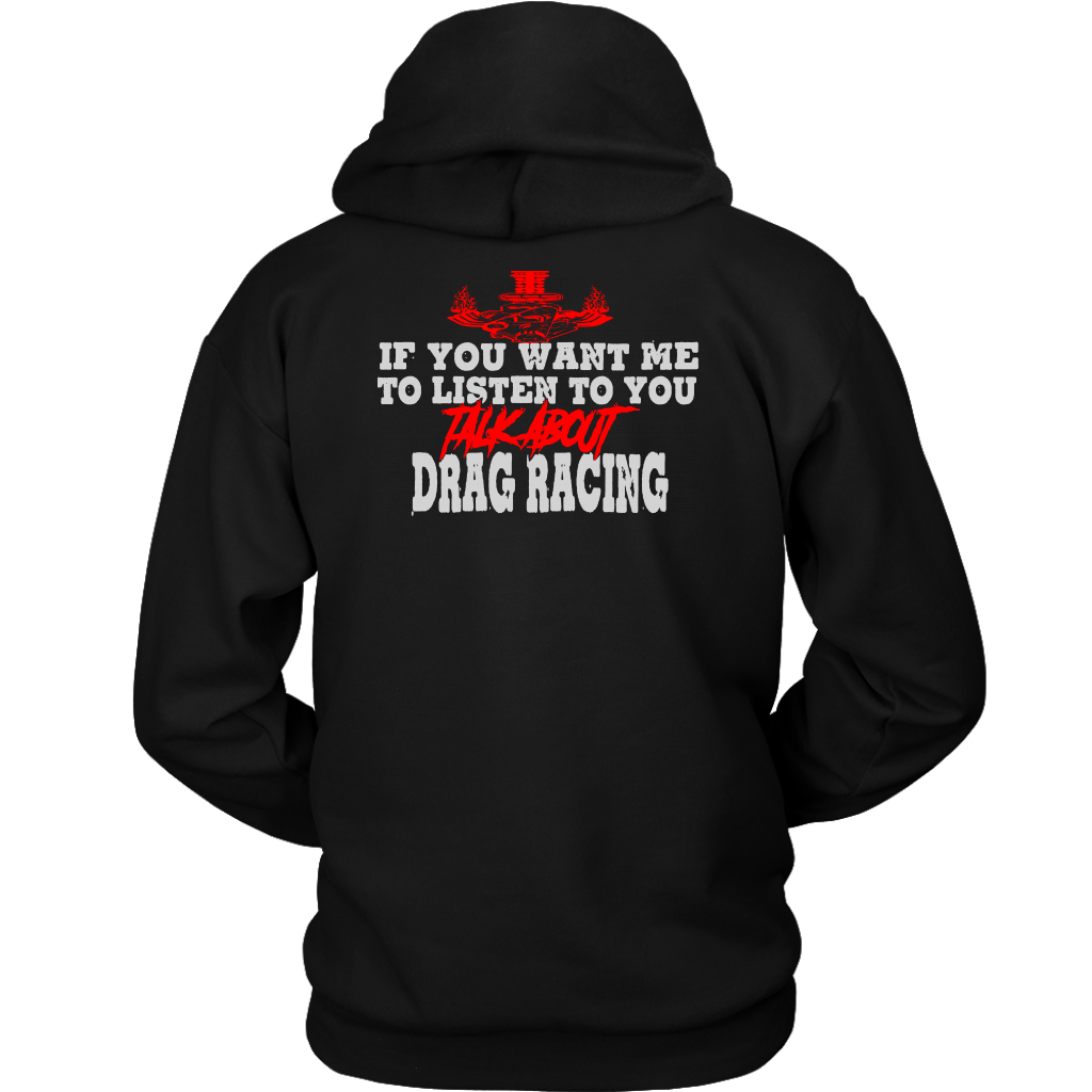 Wearing one of these "If You Want Me to Listen to You Talk about Drag Racing T-Shirts" is more than just a fashion statement; it's a statement of commitment to the lifestyle of a drag racer. Put them on with confidence to demonstrate that you're always up for a chat about acceleration, speed, and the thrill of the race. These shirts are certain conversation starters whenever you find yourself in the company of other motorsports fans, whether at the track, a car meet, or just hanging out. Get suited up, and let everyone see how much you love drag racing.