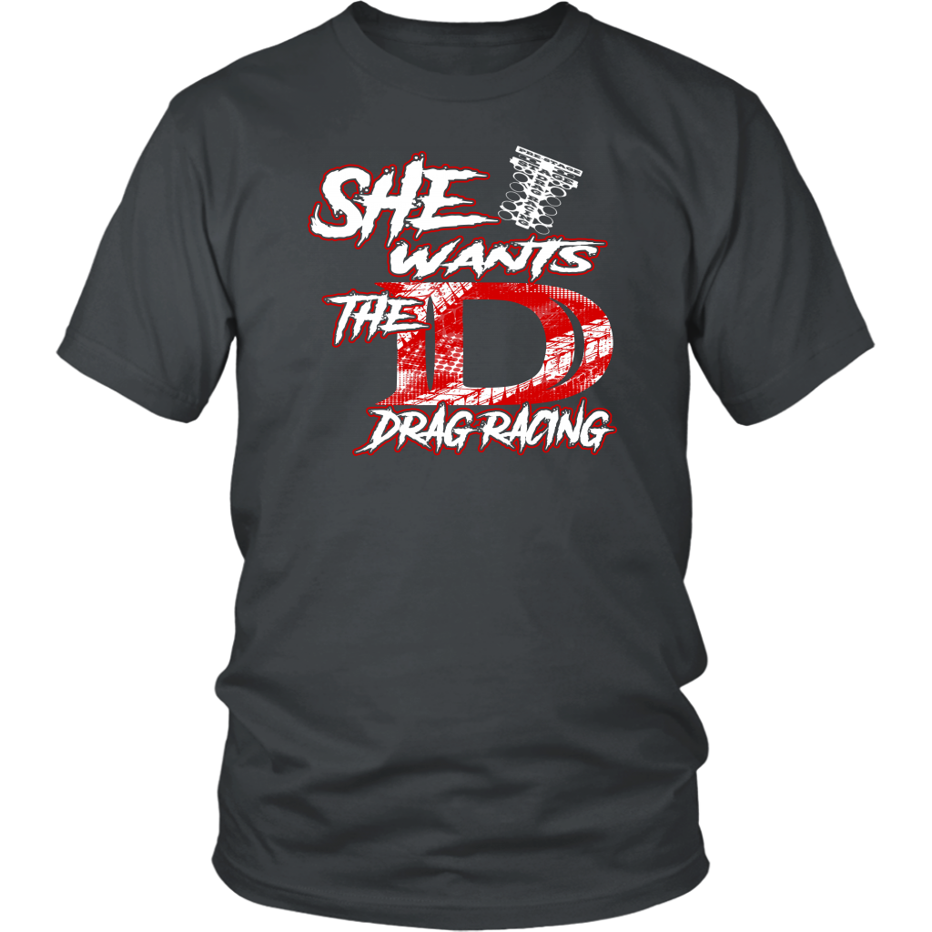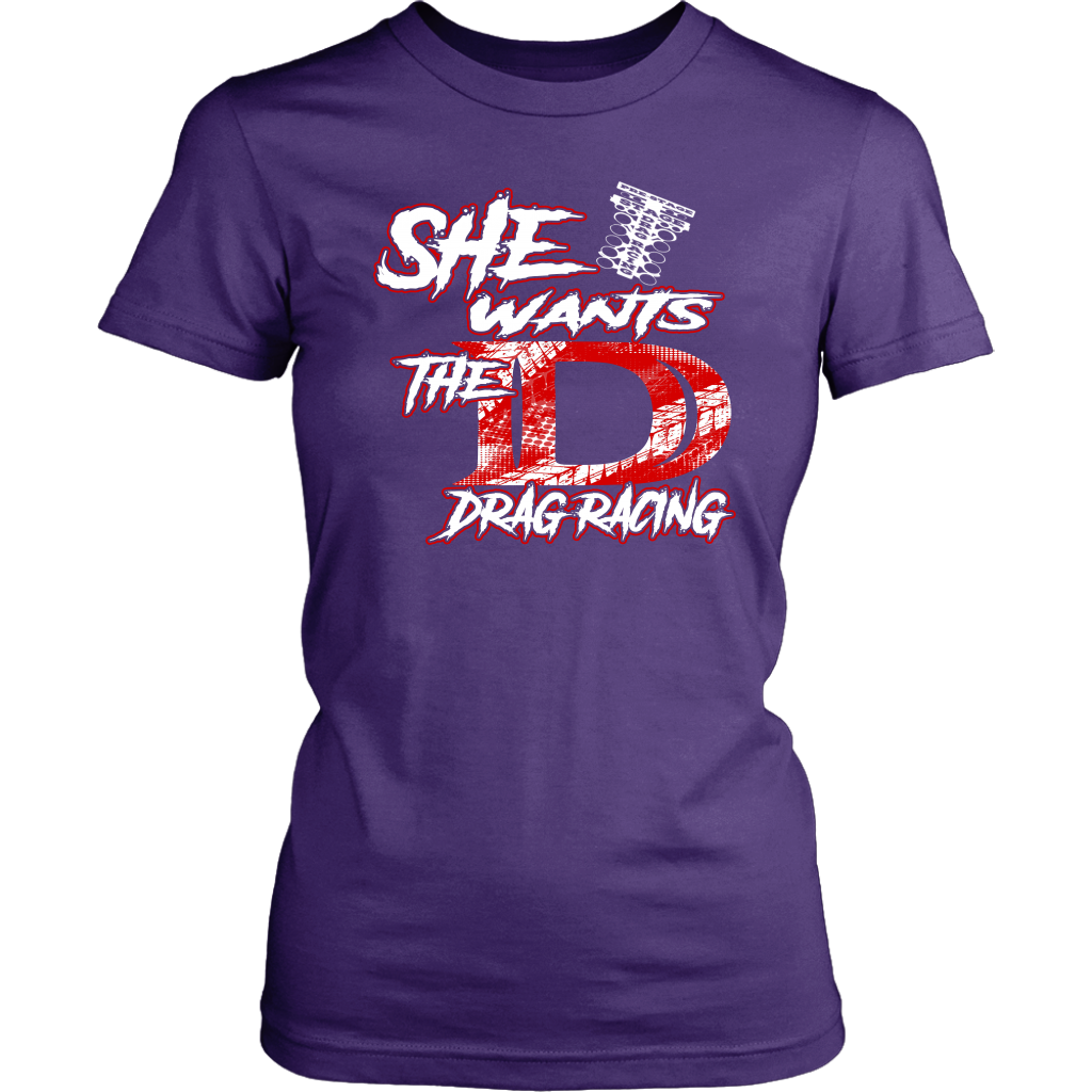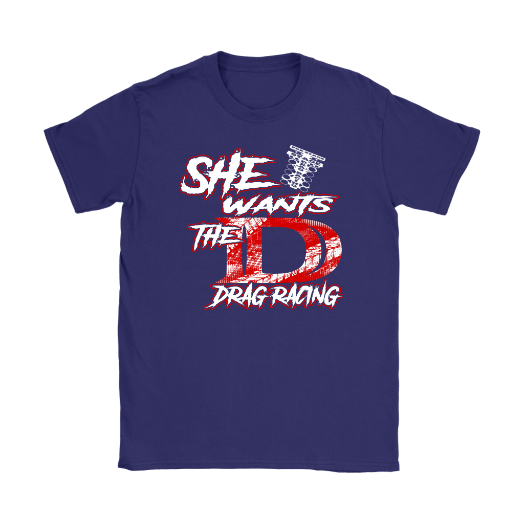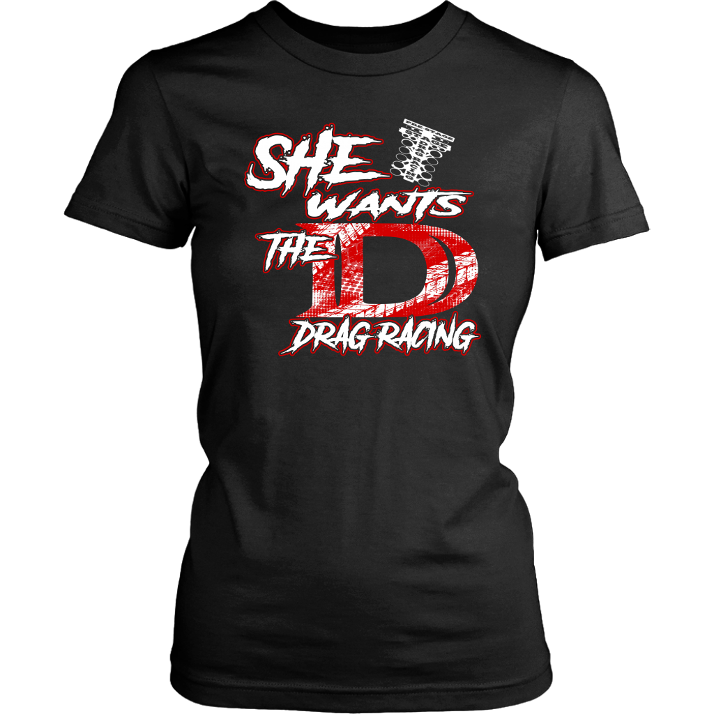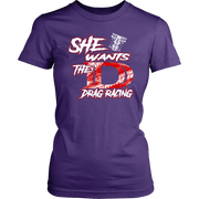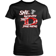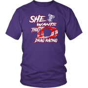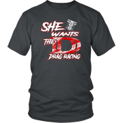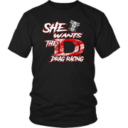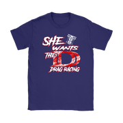 Designed with care, the "She Wants The Drag Racing" logo conveys your passion for the sport in a subtle yet striking way. This shirt embodies the spirit of speed and intensity, whether you're driving or applauding from the sidelines.