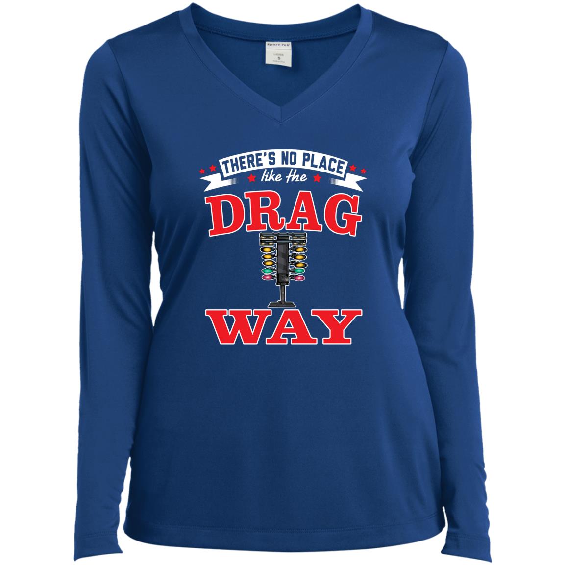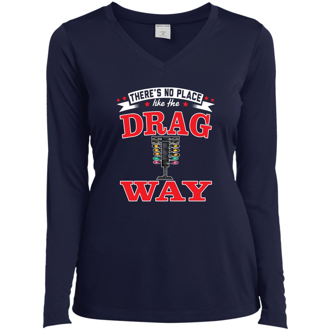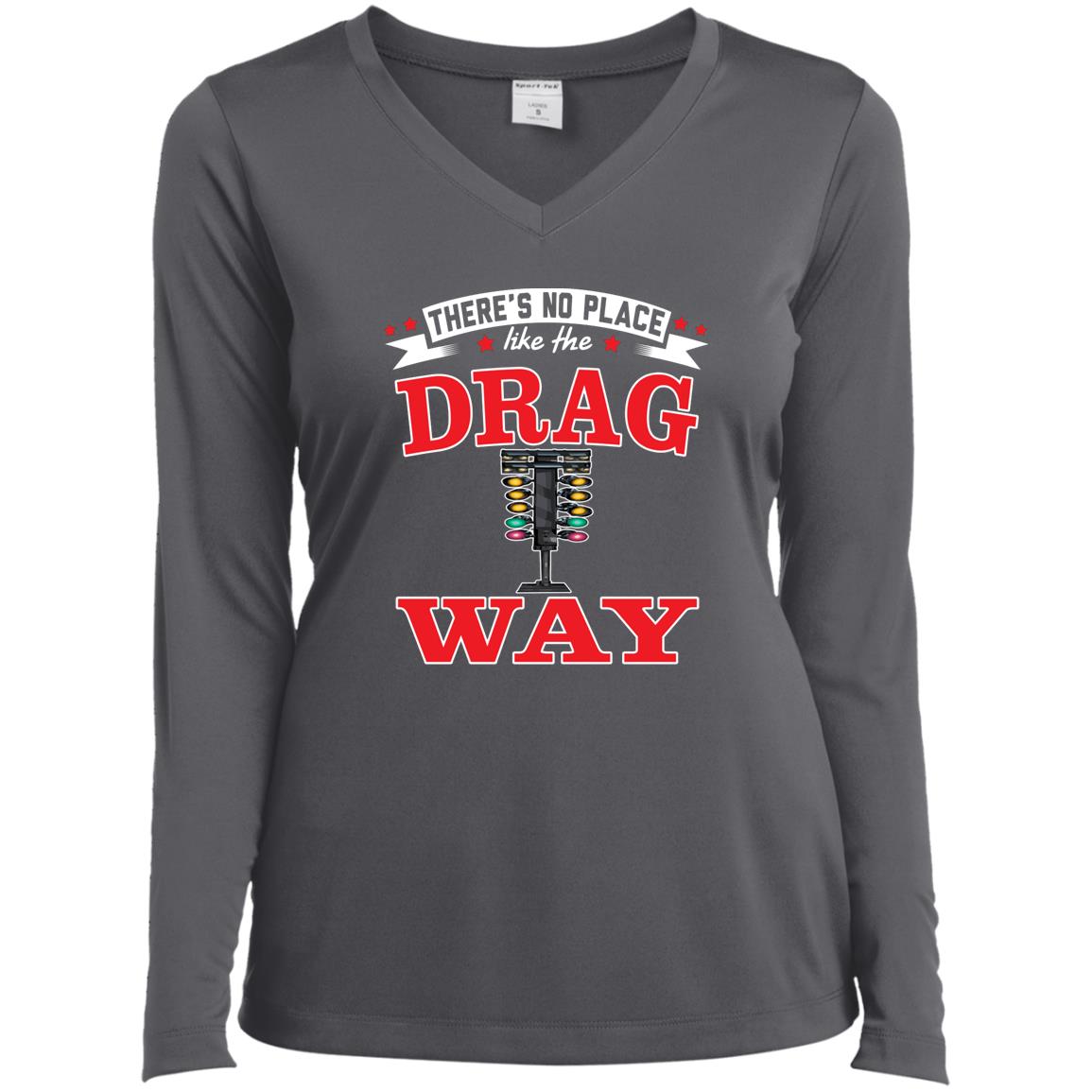 There's No Place Like The Dragway Ladies’ Long Sleeve Performance V-Neck Tee