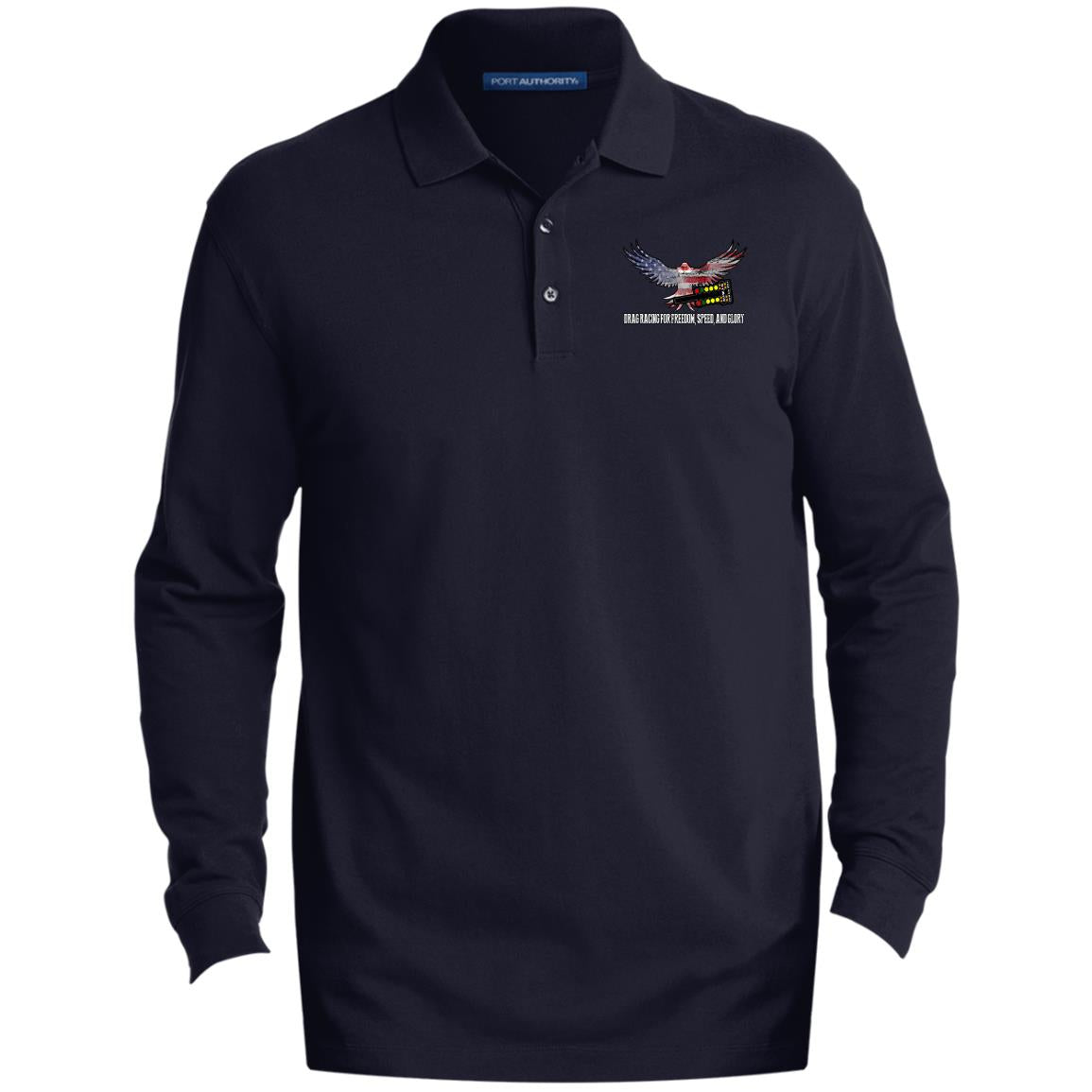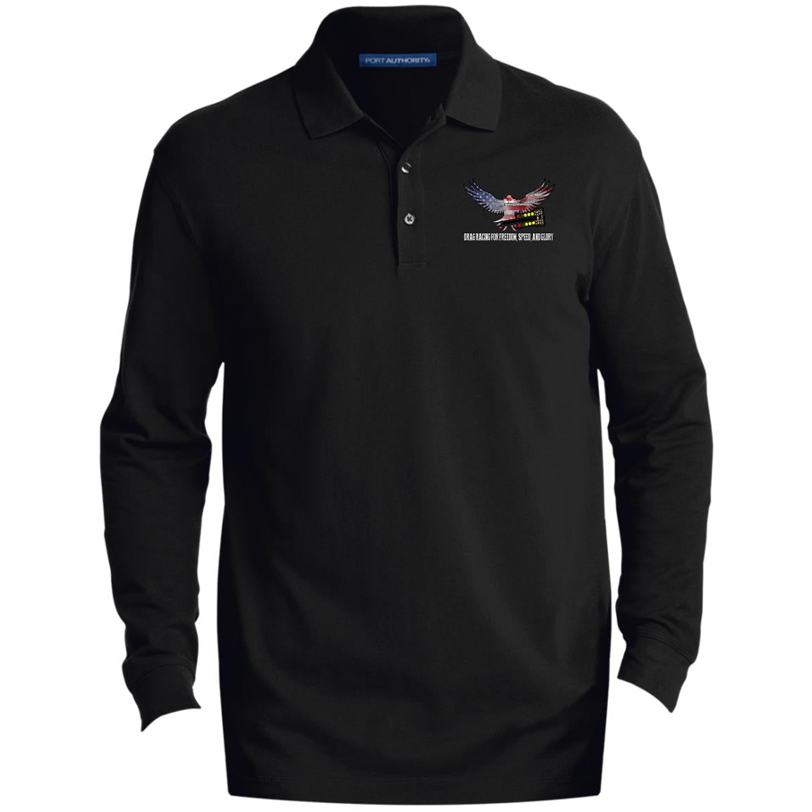The Drag Racing for Freedom, Speed, and Glory Men's EZCottonTM Long Sleeve Polo is the perfect blend of fashionable ease and long-lasting strength. This polo expresses your competitive attitude while helping you look and feel your best in any setting. This outstanding polo will enhance your racing experience and leave a memorable impact.
